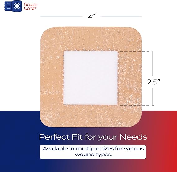 • Versatile and Secure: Ideal for a range of wounds—from surgical sites to diabetic ulcers—GauzeCare 4×4 foam dressings stay securely in place, thanks to their strong yet gentle adhesion