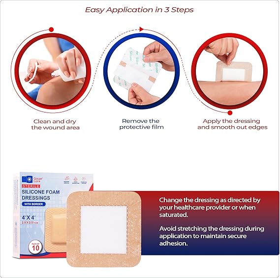 • Waterproof and Breathable: The bordered foam dressings 4×4 are designed to be waterproof, protecting your wound from outside moisture while allowing oxygen and water vapor to pass through, which aids in the healing process